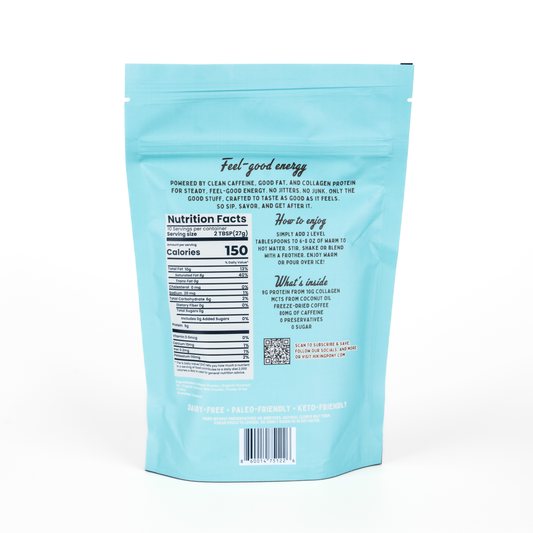 Collagen coffee boosts metabolism and cognitive function with three energy sources in one. Each serving provides 9g of protein from collagen peptides, MCTs from coconut oil and coconut milk powder, and freeze-dried coffee. Jumpstart your day in seconds!